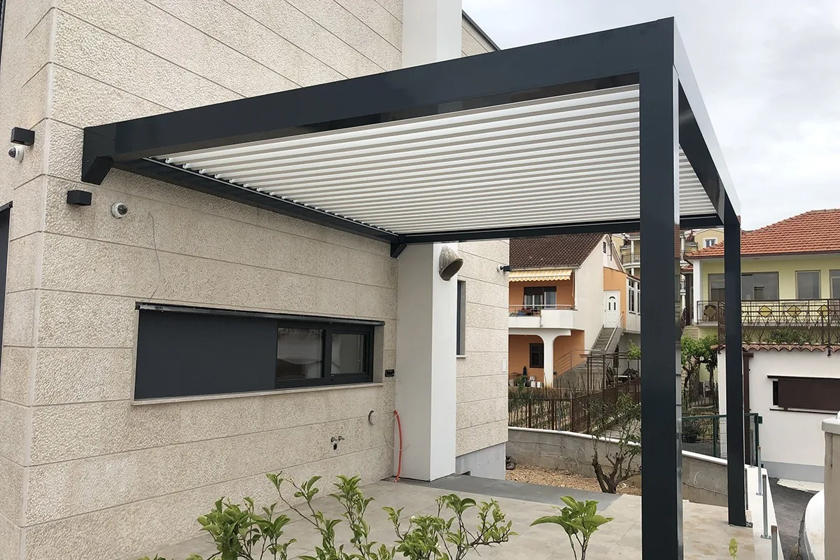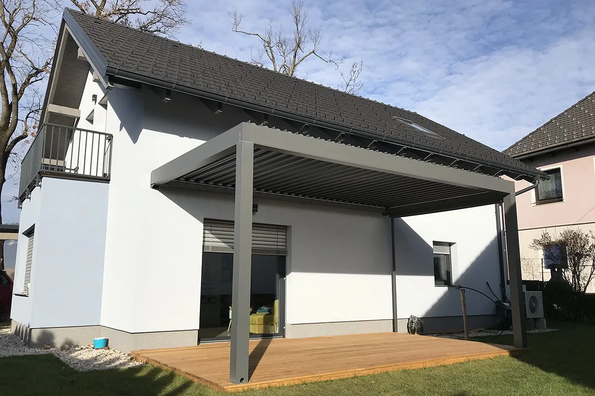 Mit ihren drehbaren Paneelen passt sich Futura den Wetterbedingungen an und schafft das Mikroklima, das Sie für Komfort und Schutz das ganze Jahr über benötigen. Ob als Pergola für den Garten oder Balkon oder für größere Flächen, dieses Modell gewährleistet einen einwandfreien Betrieb und lange Haltbarkeit.