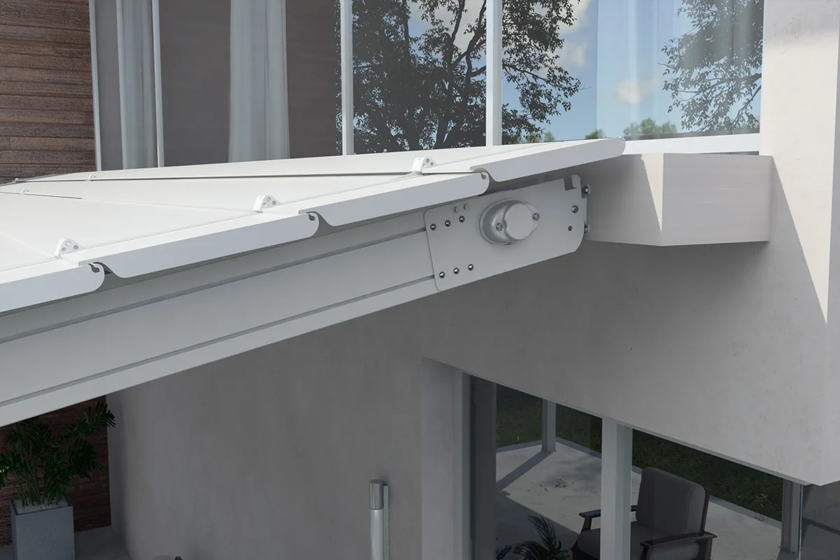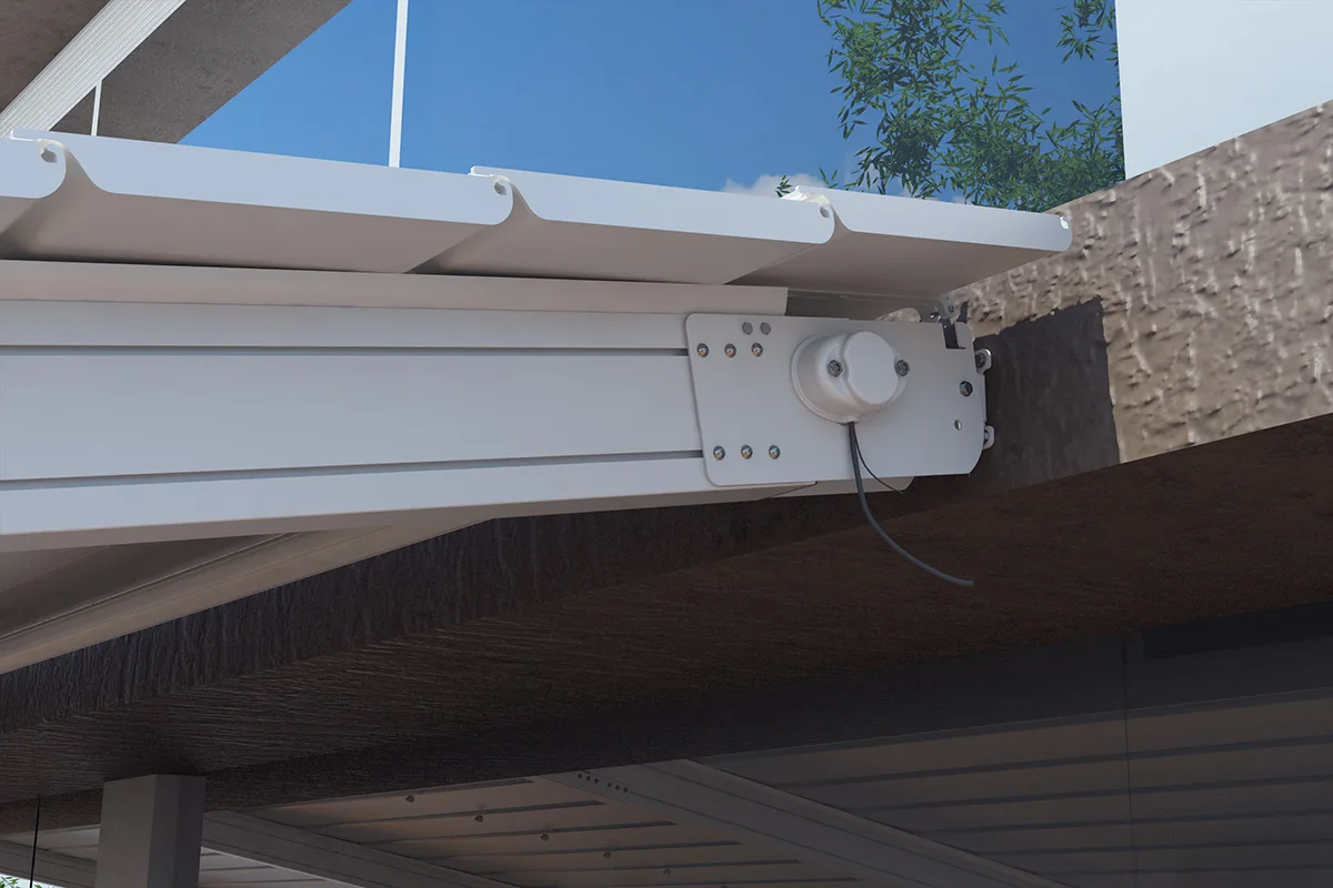 Mit Elektromotoren der Firma somfy. Es besteht die Möglichkeit, zwei Elektroantriebe zu installieren, wenn die Pergola größer als 60m² ist. Die Elektromotoren werden in der Pergolaachse installiert.