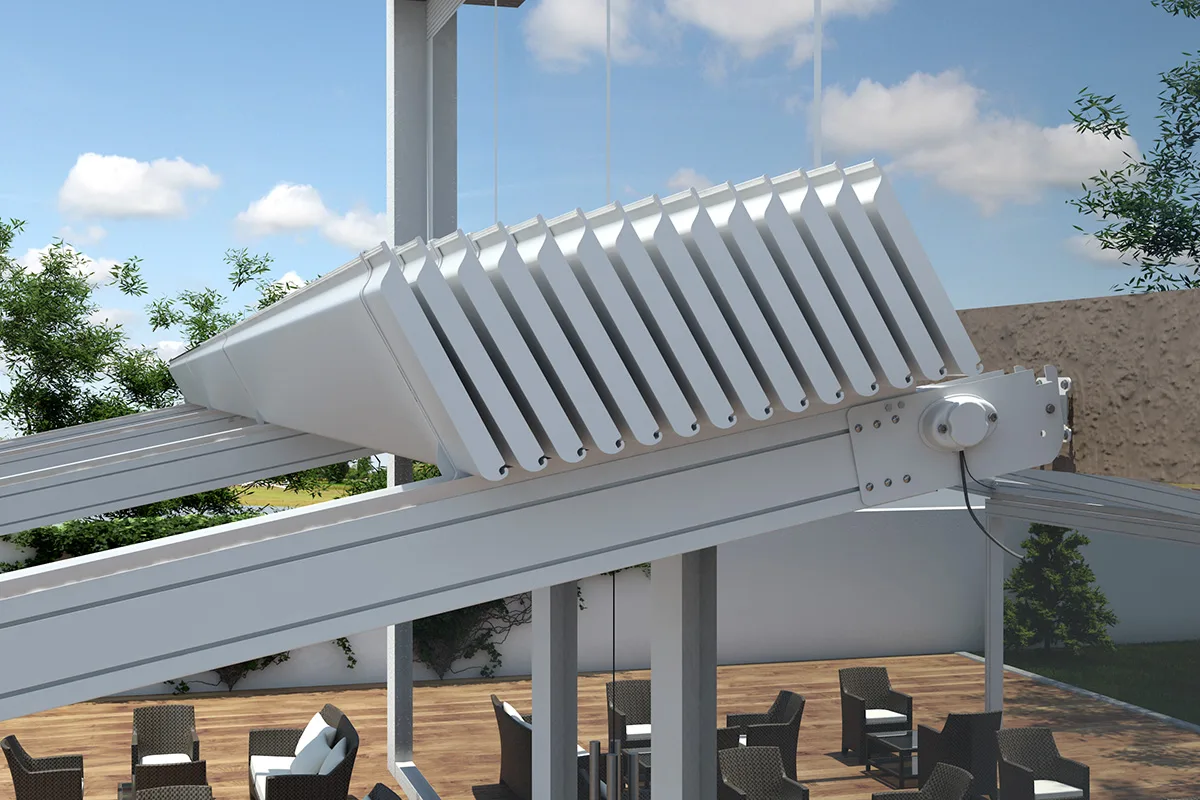 Dank ihrer Fähigkeit, Licht, natürliche Belüftung und Temperatur zu regulieren, bietet Persa eine vollständige Kontrolle über das Mikroklima. Mit einer Mindestneigung von 5 % lässt sie sich leicht in jedes architektonische Design integrieren und ist damit eine zeitlose Wahl unter den Aluminium-Pergolen für Wohn- und Gewerbeflächen.