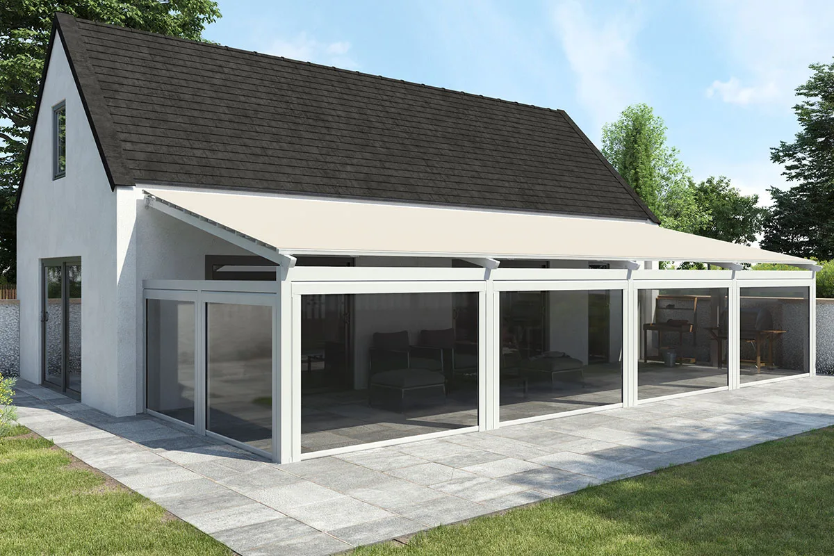 Mit Elektromotoren der Firma somfy. Es besteht die Möglichkeit, zwei Elektroantriebe zu installieren, wenn die Pergola größer als 70m² ist. Die Elektromotoren werden in der Pergolaachse installiert.